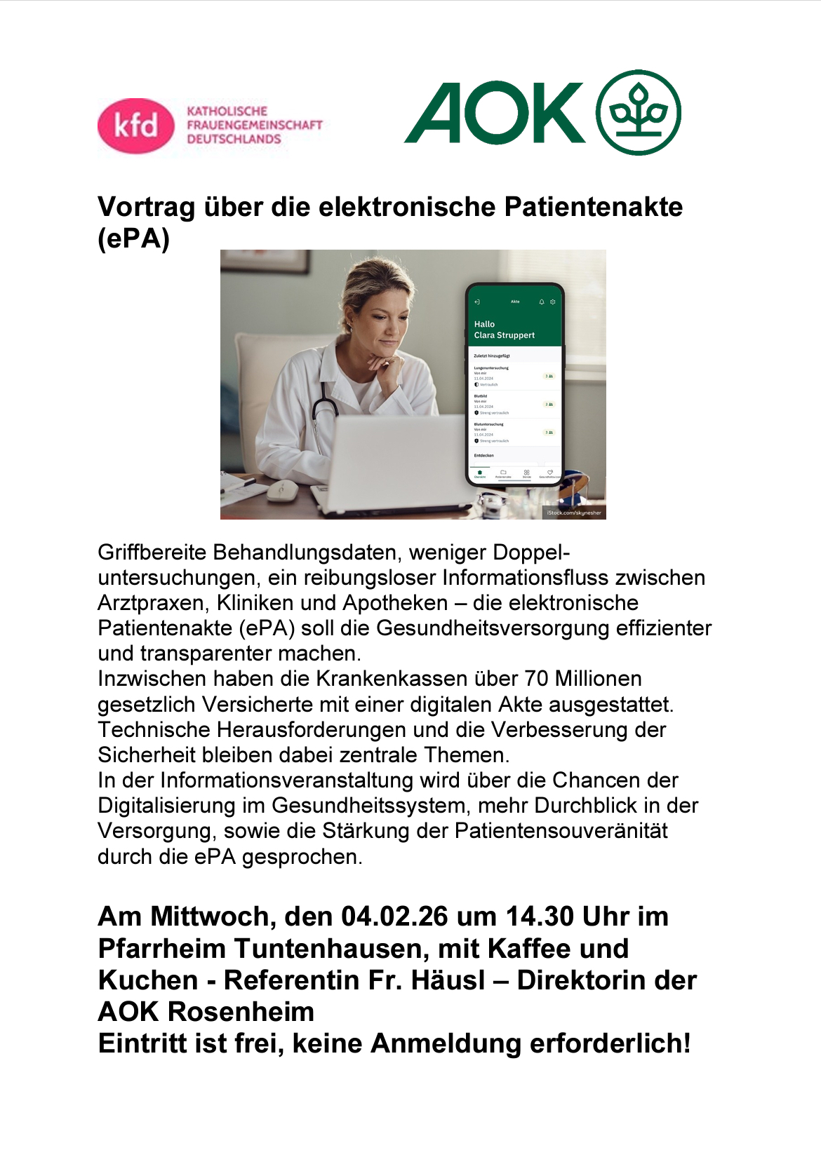 Jeden Dienstag (außer in den Ferien) von 8.30 – 9.30 Uhr im Pfarrheim Tuntenhausen – wg. Versicherung nur für Mitglieder der kfd oder OGV – Unkostenbeitrag € 1,50